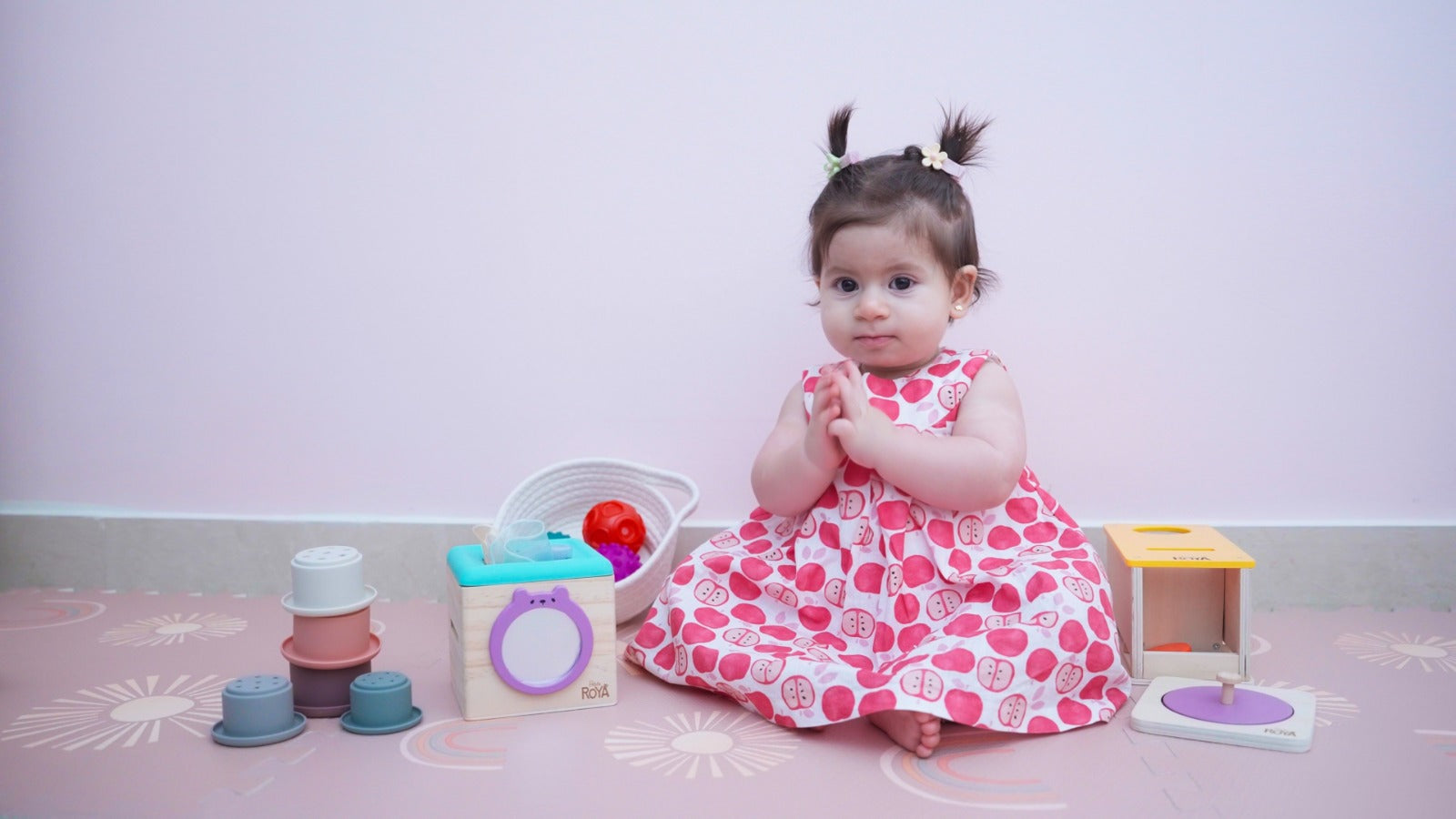 This soft basket is filled with a variety of textured balls designed for squishing, rolling, and exploring. Each ball stimulates different senses, helping babies discover contrast, pressure, and fine motor control.